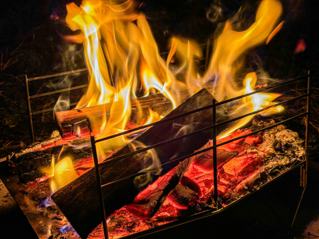 燃え上がる炎と確かな熱を放ち続ける熾火(おきび)を同時に楽しむ時間、まさに最高の贅沢です