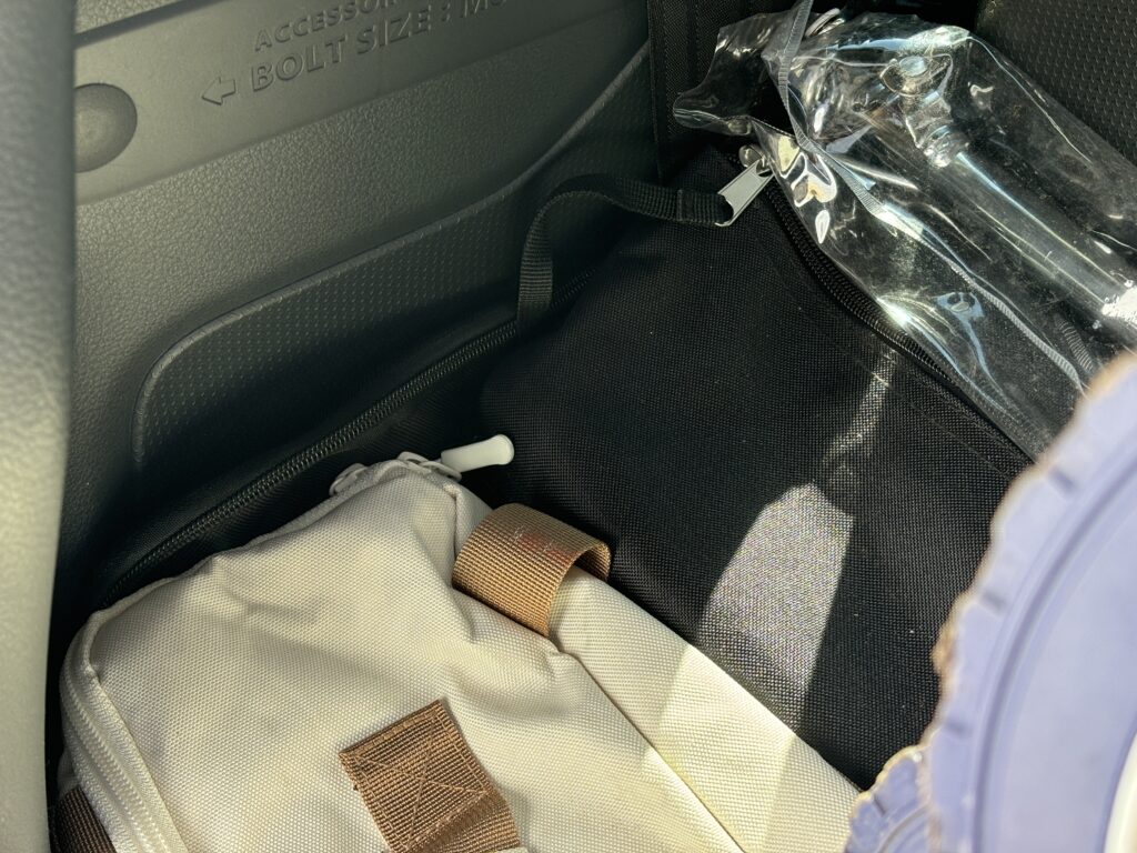 こんなわずかな隙間にも入ってしまうほど薄いので、車の積載でも自宅の収納でも全然場所をとらないんです