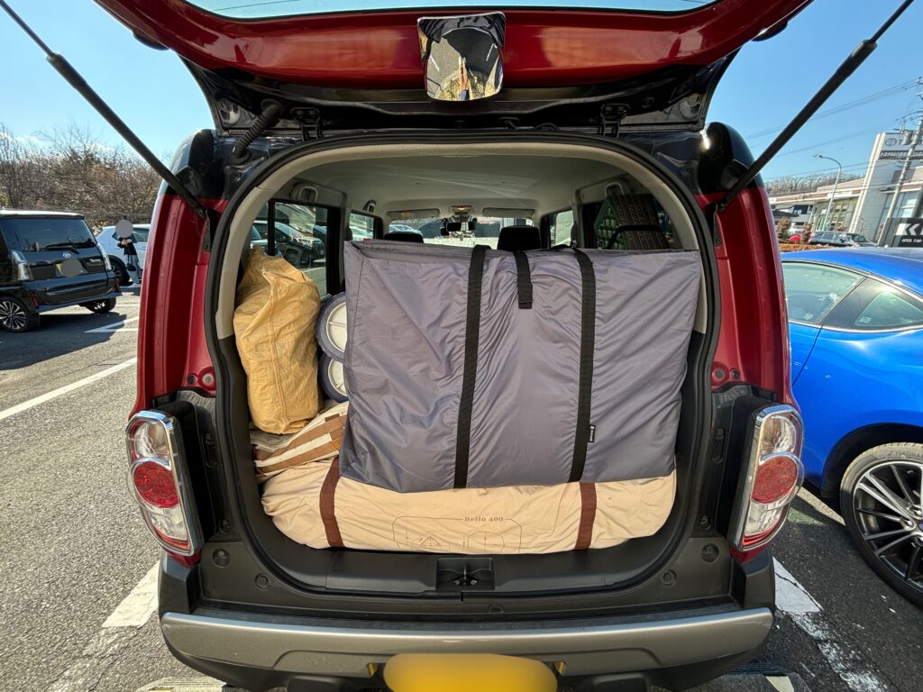 これはキャンプギアでギッチギチになっている荷台の写真ですが、この中にソロライトグリルが積まれています
