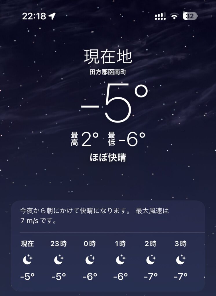 気温はみるみる下がり、寝る前の22時過ぎの時点でマイナス5℃になっていました