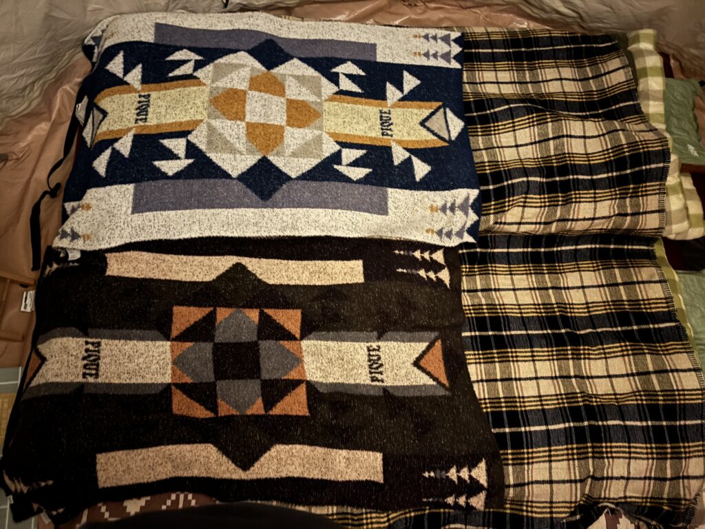 さらに寝袋の上にブランケットを2枚かけて保温力を高める作戦です
