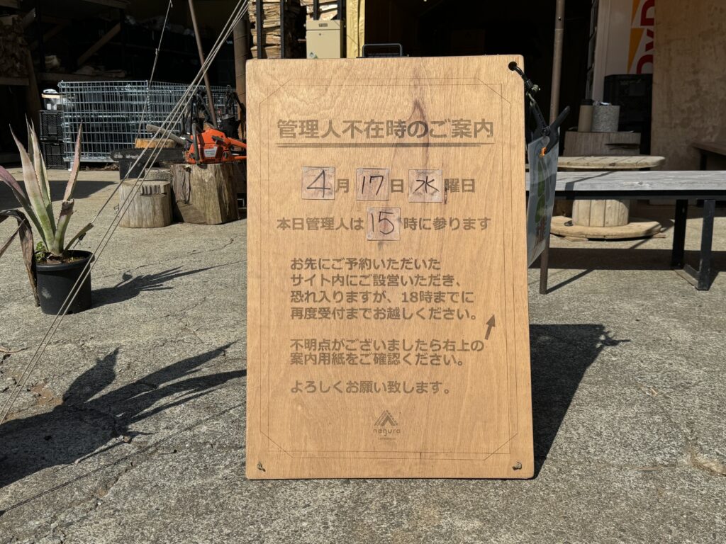 いない時はこんな感じの看板が立っているので、先に設営してから手続きをしに行ってください
