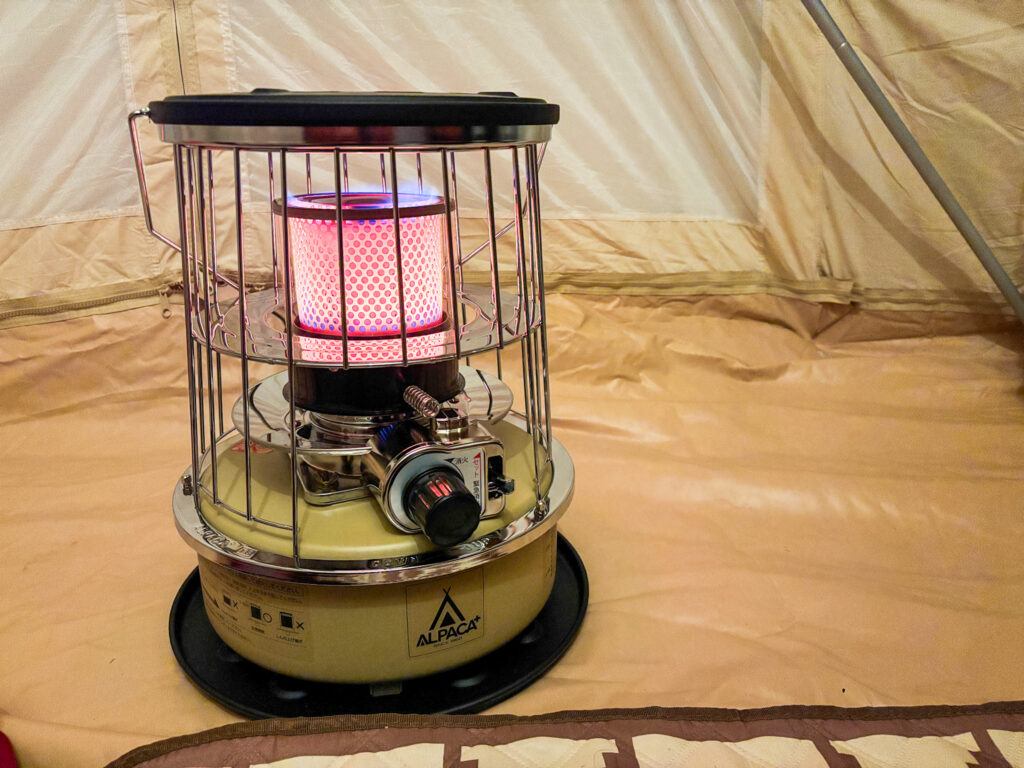 僕たちが使っているBello400という4〜6人用の大型ベルテントでもしっかり暖められる火力が石油ストーブにはあります