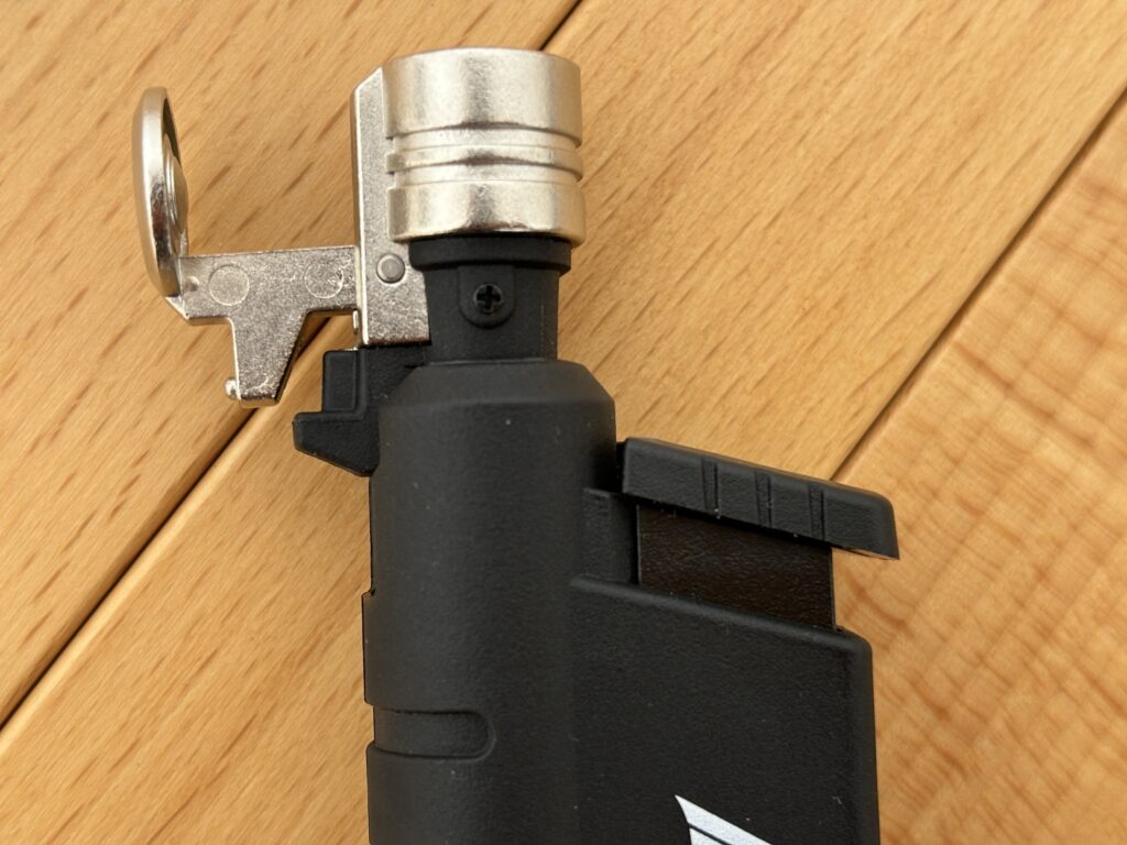 斜めになったことで、握った時に点火スイッチに指をかけやすくなっています